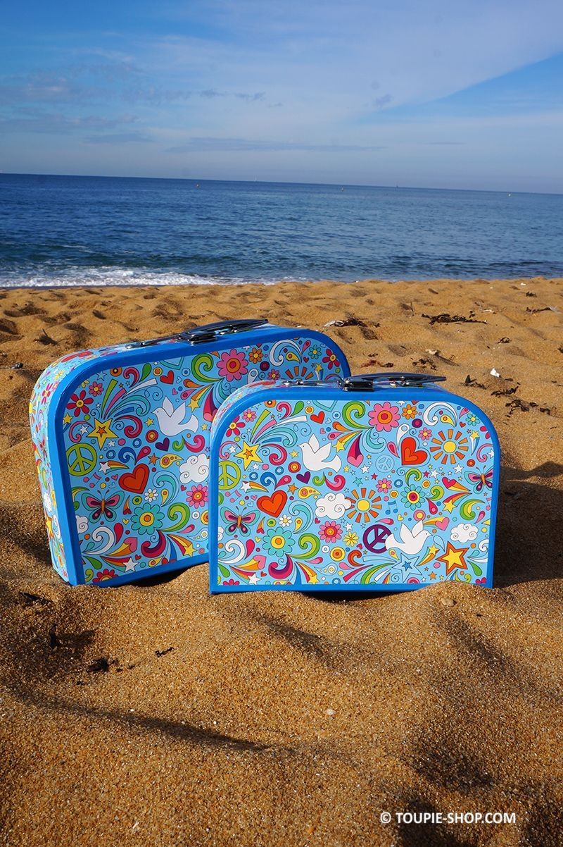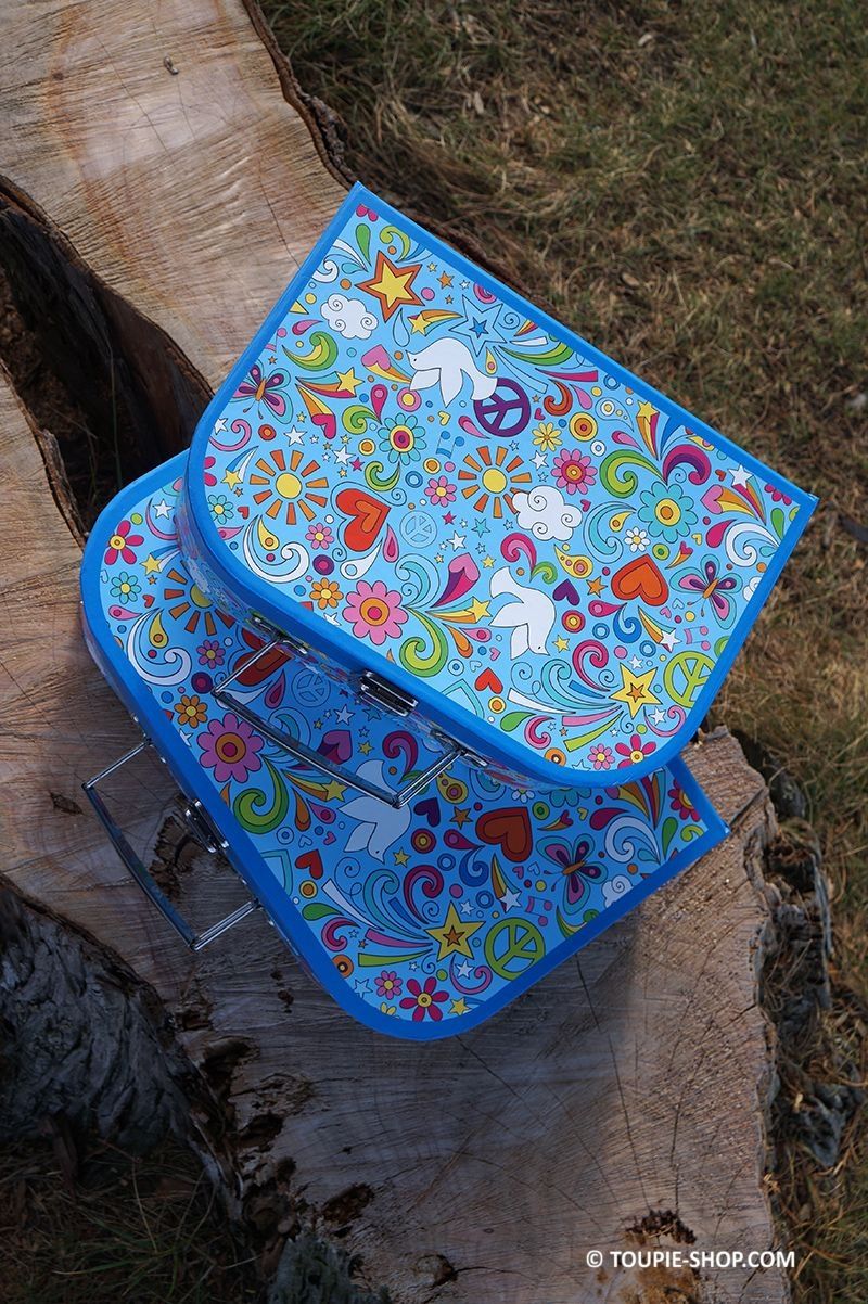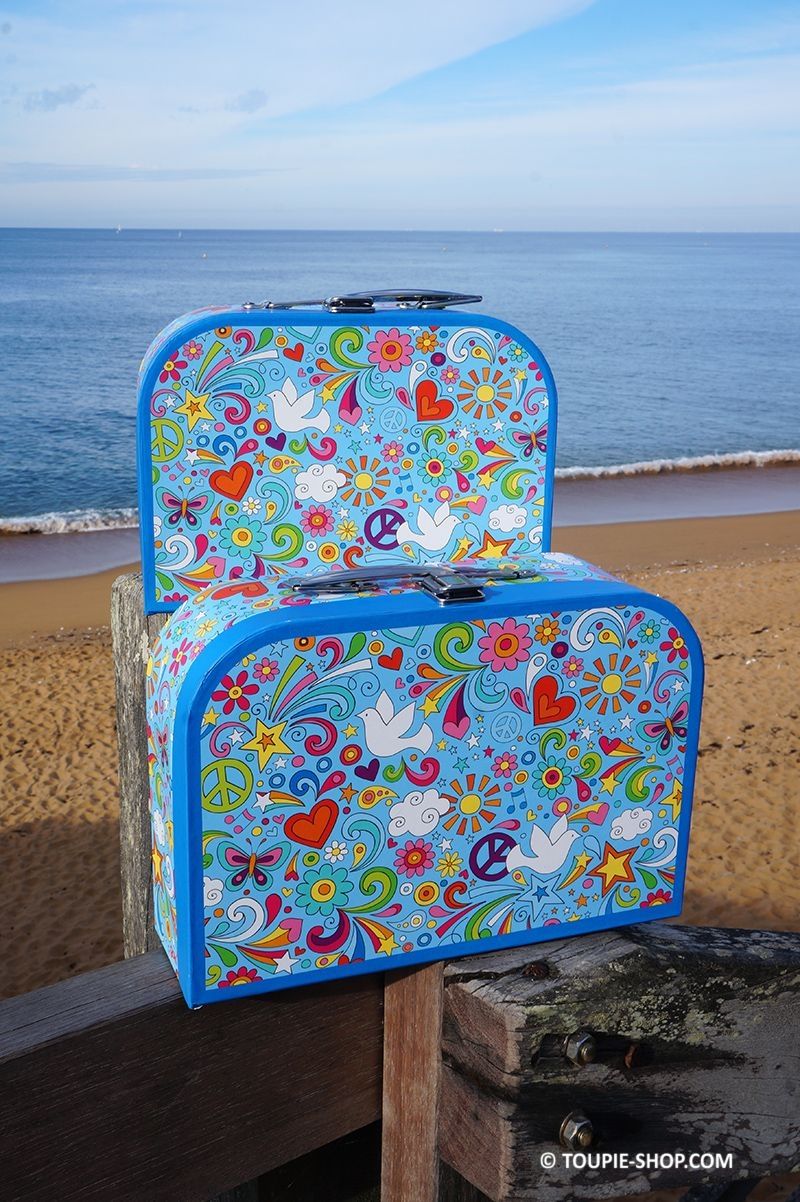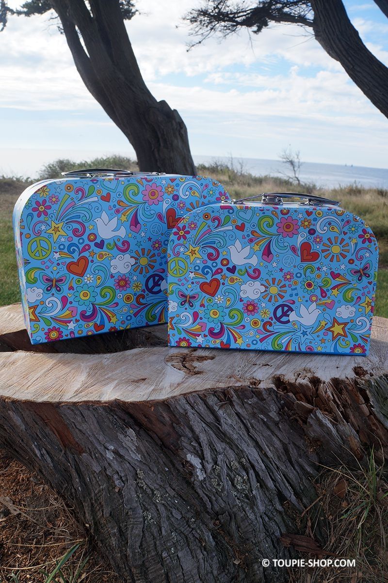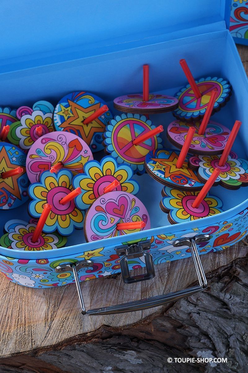 Toupie send love ! Voici une joyeuse valise en carton Peace and Love pour ranger votre collection de toupies.