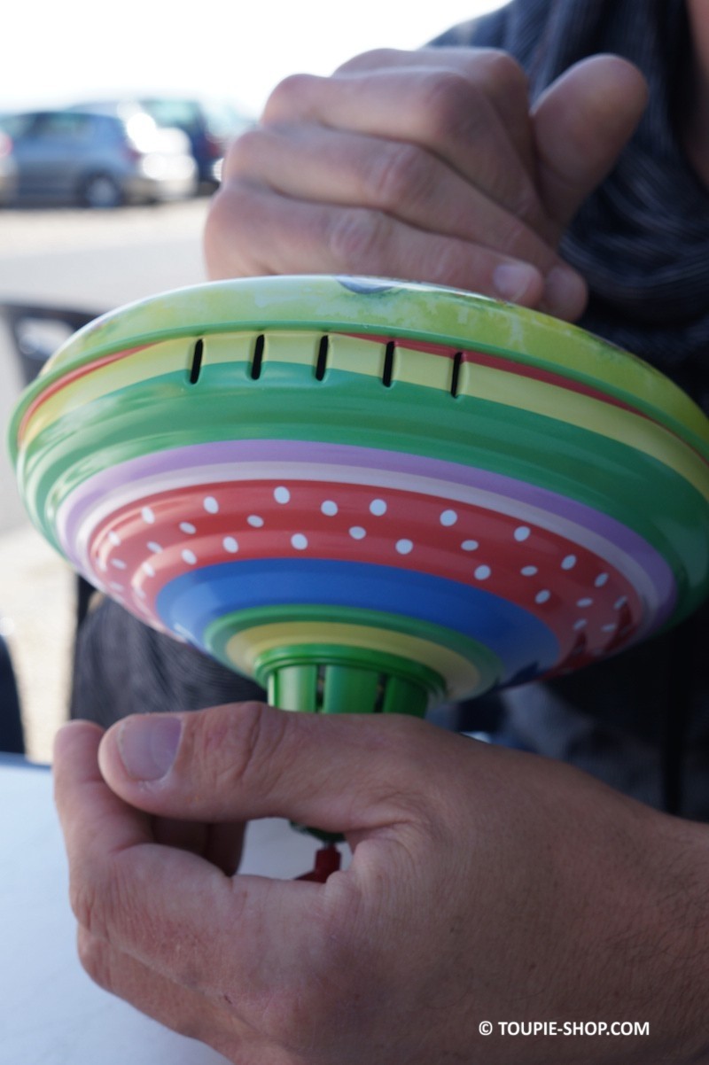 Lancer : aisé, une toupie pour les tout petits. Grâce à son lanceur intégré, il suffit d’appuyer plusieurs fois pour la faire tourner.
