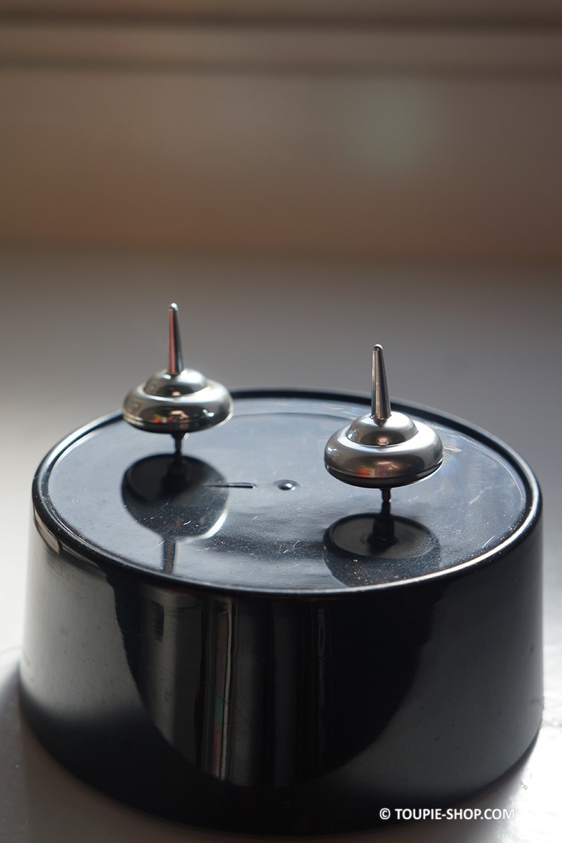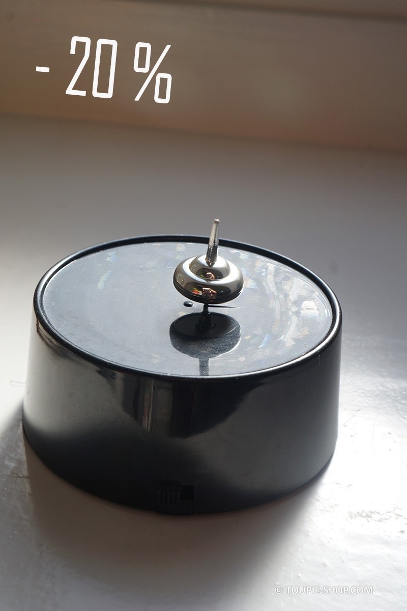 A L'ARRÊT : La toupie Infinie est constituée d'un socle en plastique et d'une petite toupie en métal magnétique, le tout livré dans un packaging cartonné.