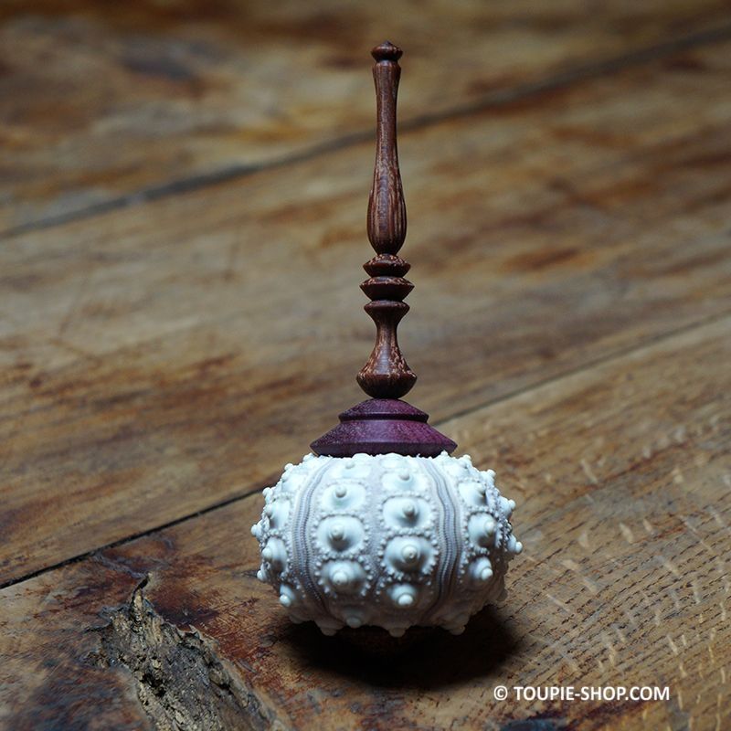 A L’ARRÊT : De magnifiques matières aux couleurs contrastées, corps en coquillage, tige et pointe en bois précieux : l’Amarante (aux teintes fuchsia) et/ou le bois de Wacapou (tacheté), cette grande toupie artisanale au design made in France est un objet de collection original. Chaque oursin est unique, son diamètre varie de 55 à 85 mm.