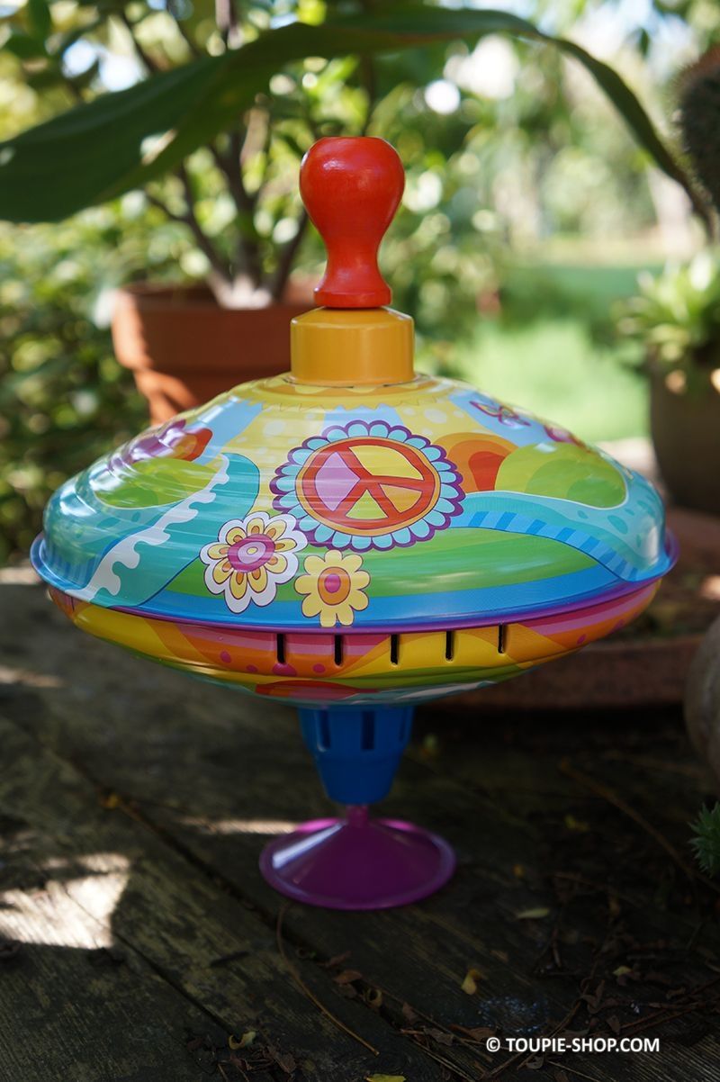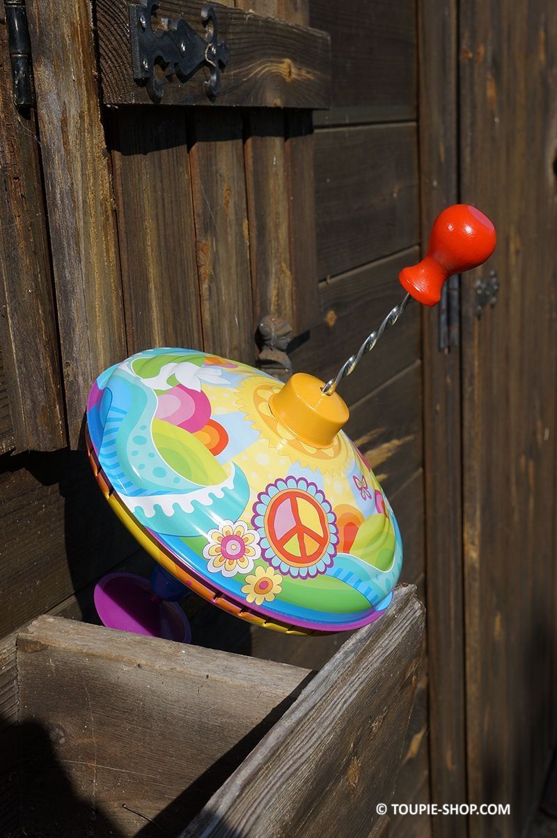 LANCER : Avec le fonctionnement d'une ancienne toupie avec lanceur, dit à "crémaillère", équipé d'une poignée en bois et d'un pied de stabilité, ce jouet d'éveil en métal est adapté aux petites mains (cadeau bébé, enfant dès 1 an), il suffit d’appuyer plusieurs fois sur le lanceur pour faire tourner la toupie Peace and Love. Les enfants adorent la simplicité du mode de fonctionnement mécanique de la toupie.