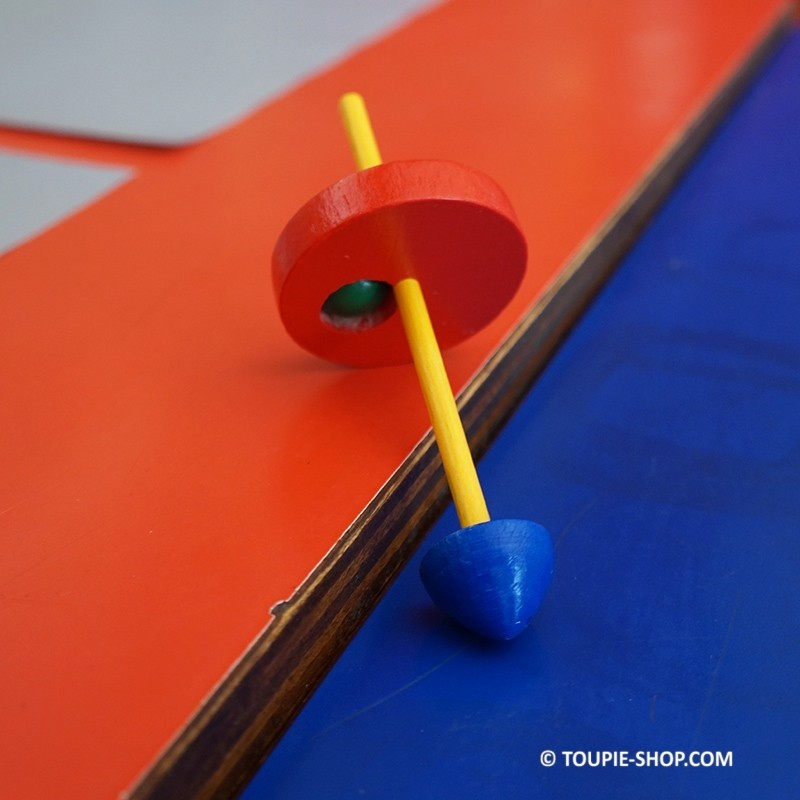 A L’ARRÊT : Une toupie à construire ! La toupie expérimentale vous arrivera en 3 morceaux : la tige munie d’une pointe, le corps (un anneau avec un trou) et une bille, mon tout en bois coloré. Ce jeu original comprend également 2 anneaux en papier bicolore illustrés des 2 côtés. Les couleurs primaires de la toupie peuvent varier.