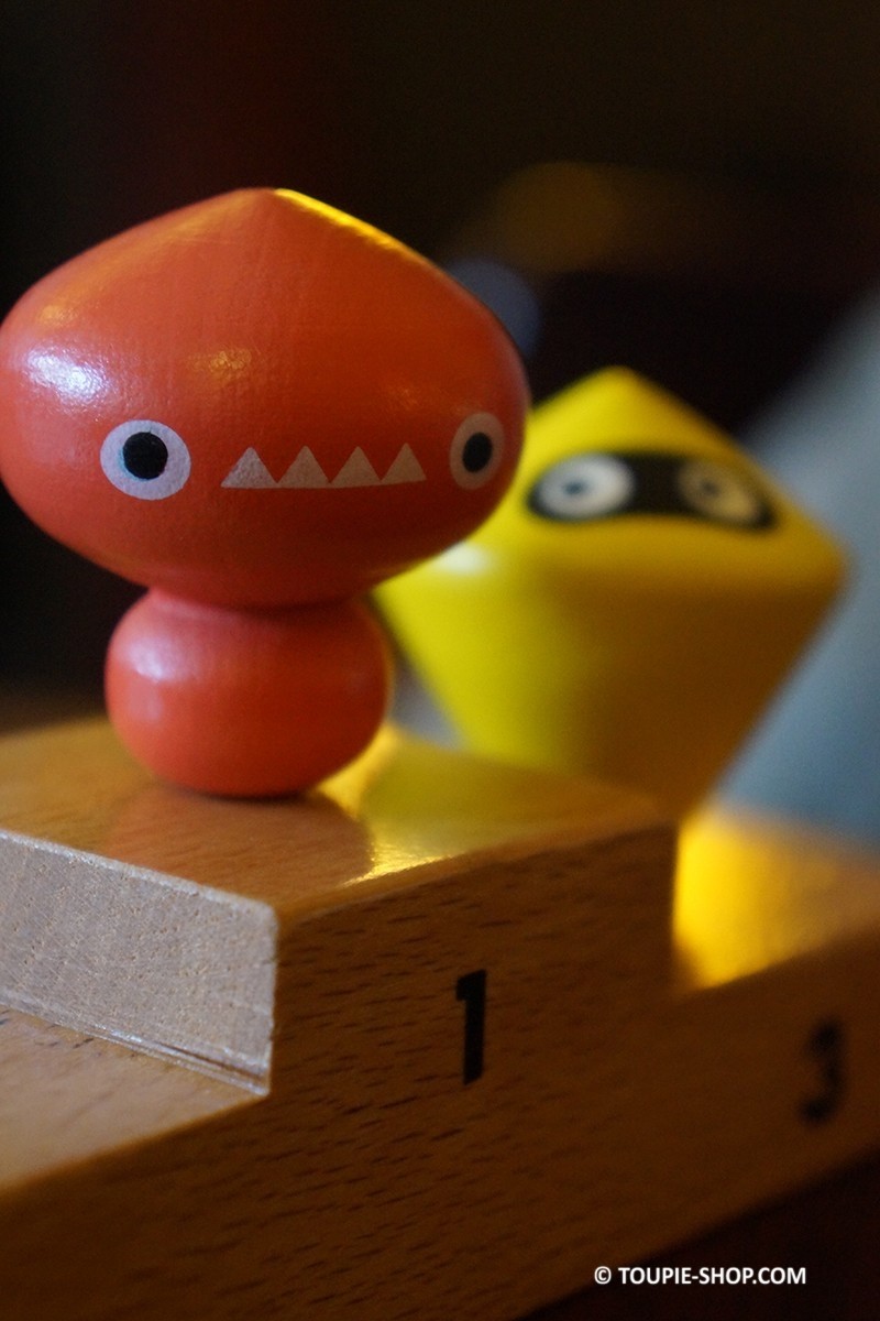 Vous recevrez ces 3 toupies en bois de hêtre avec un podium de présentation en bois (dimensions : L 135 mm x l 45 mm x h 35 mm). Sur le podium aux 1ère, 2ème et 3ème place sont présentées la toupie fantastique turquoise, rouge et jaune.