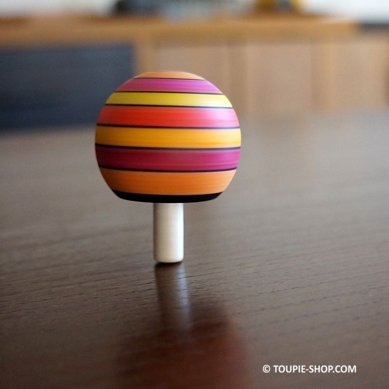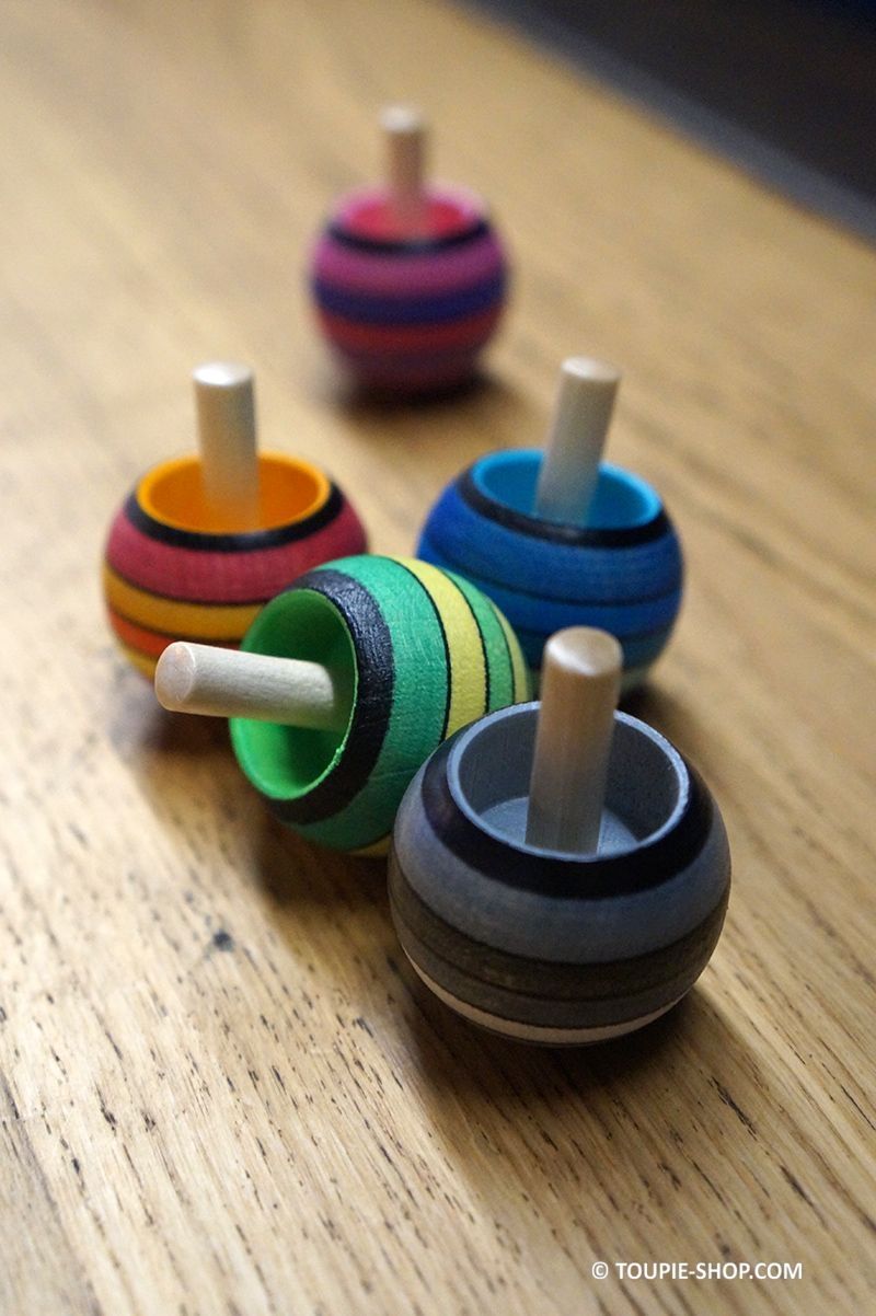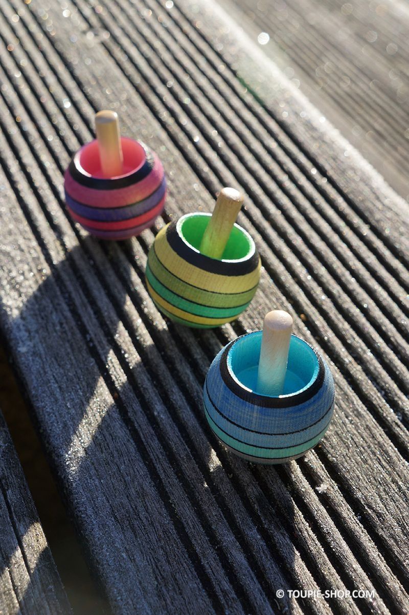 Découvrez tous nos modèles de jeux de toupie tippe top qui se retourne en rotation en différentes matières ou cette collection de toupies en bois avec les mêmes dégradés de couleurs.