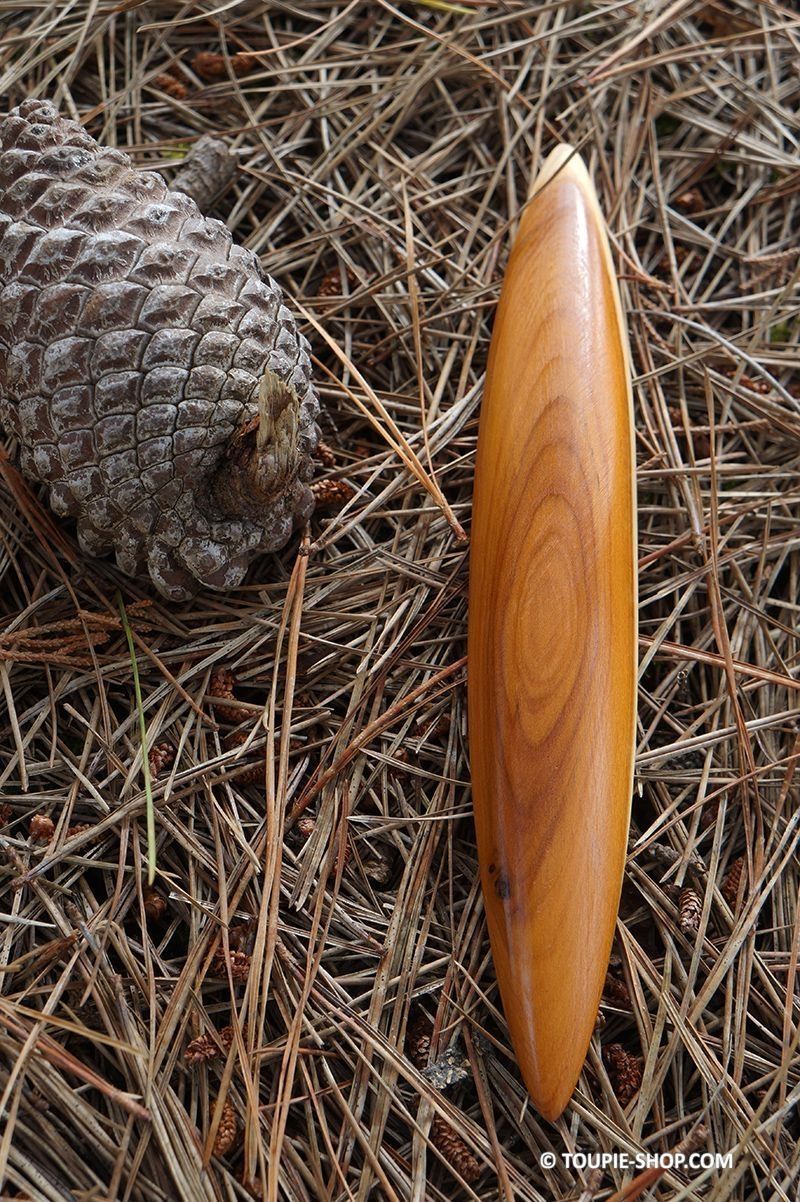 Toupie Celtique en bois de Merisier ou bois d'If, de couleur orangée finement veinée, avec un trou () laissé par un « nœud-mort » qui apparait lorsque qu’une branche d'arbre meurt, se rétrécit, tombe.