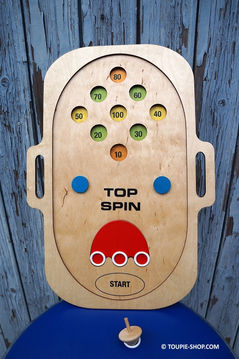 Lancez la toupie sur ce grand plateau en bois, attrapez les anneaux et marquez des points ! Un jeu d’adresse amusant !