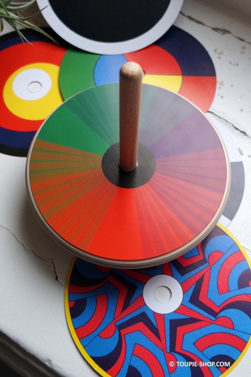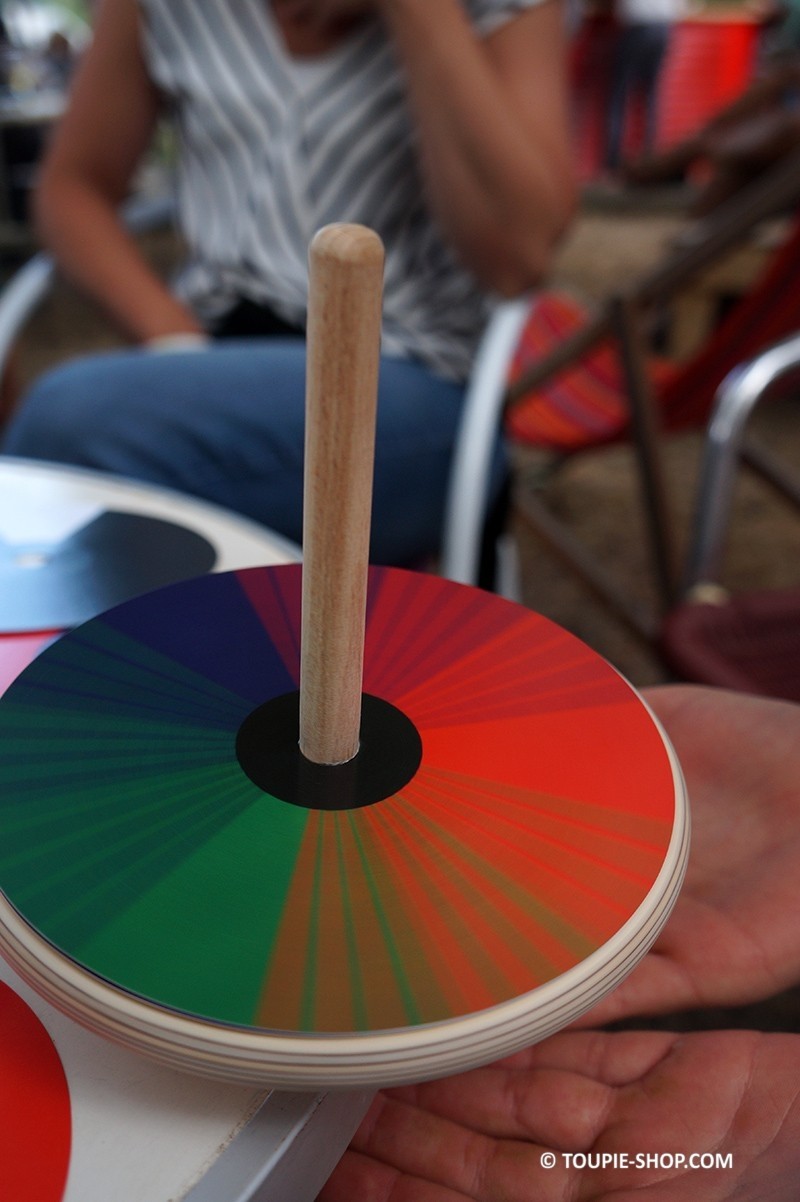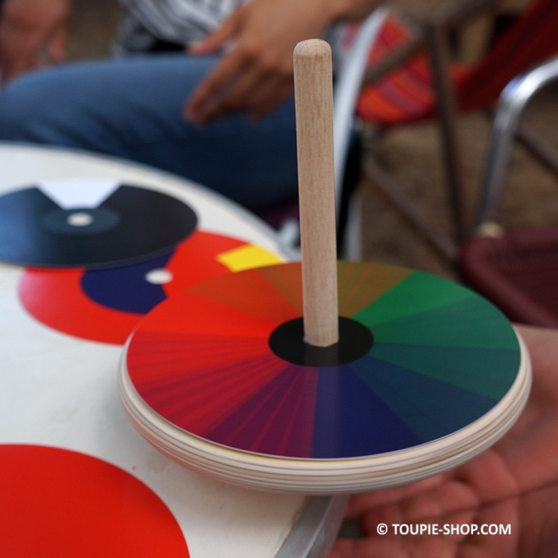 Ce sont des jeux de couleurs, cercle chromatique et illusions d'optiques liées au mélange des couleurs. Ce jouet éducatif est un cadeau original, ludique, une toupie d’Allemagne disponible en 2 tailles : grand (ici présent) ou petite toupie jeu de couleur en bois, regardez les dernières photo de toupie.