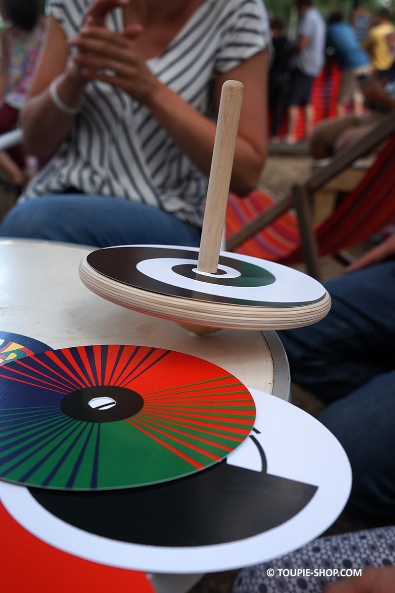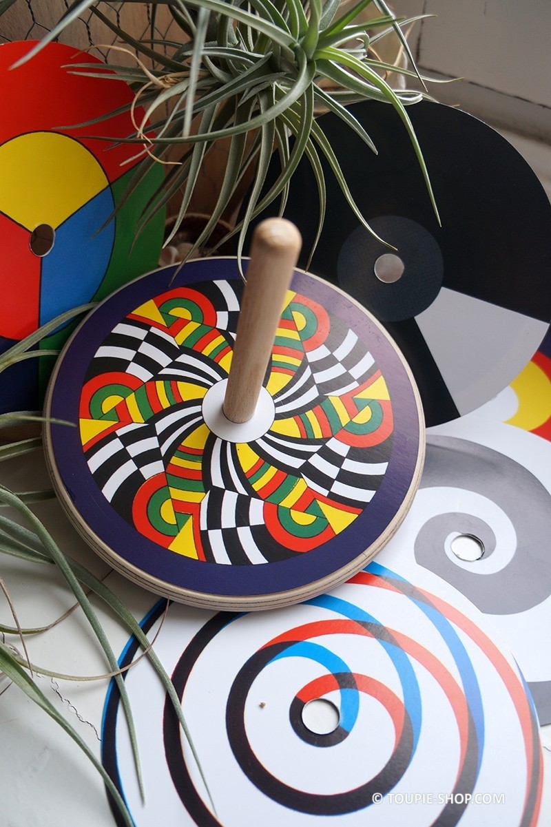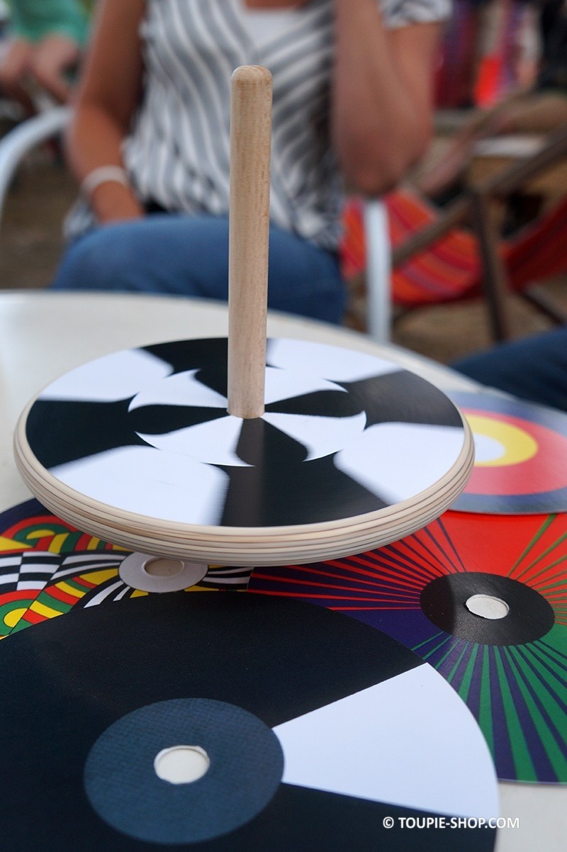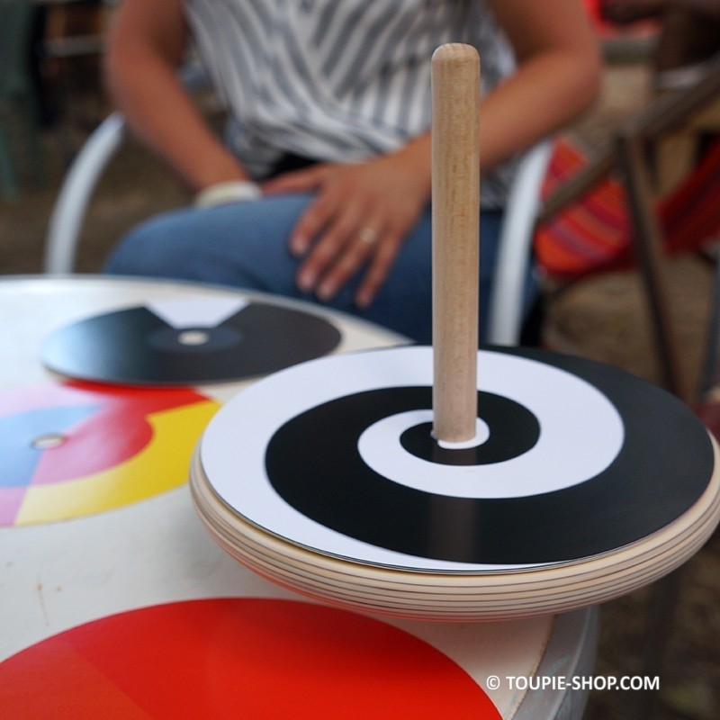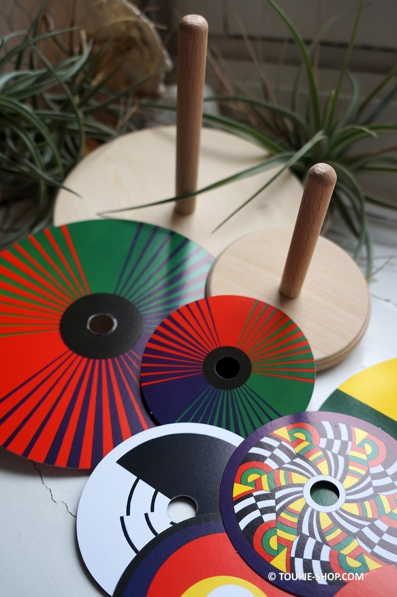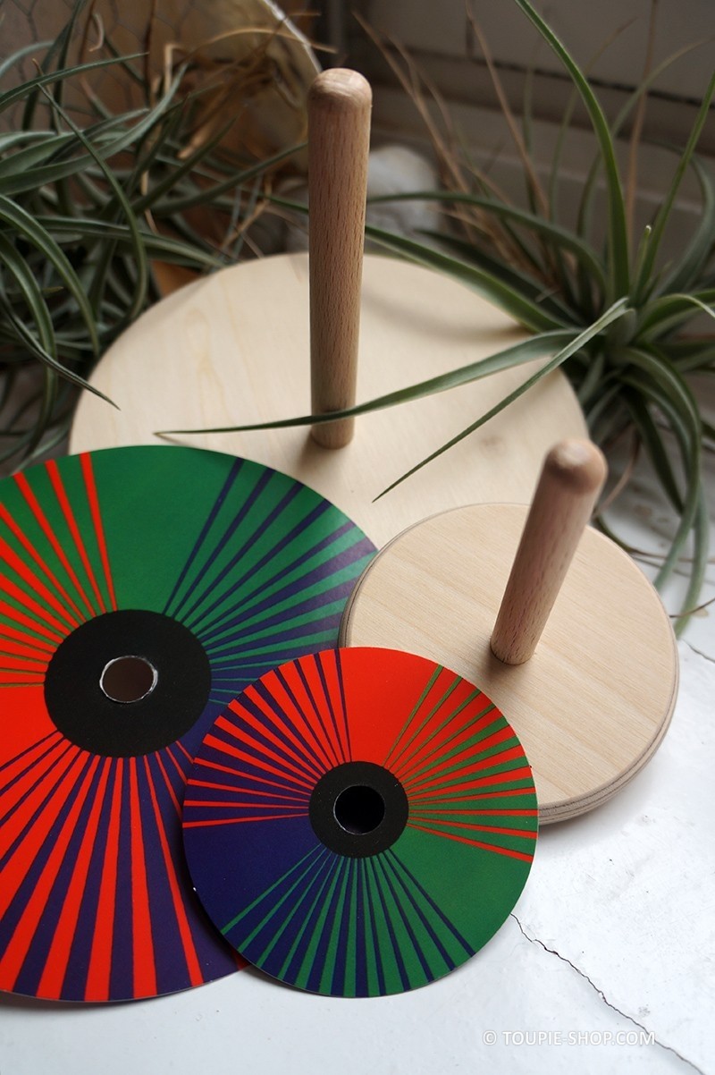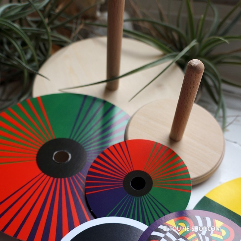 A L'ARRÊT : Ce jeu de qualité comprend une toupie en bois naturel et 6 cercles en papiers colorés ou n&b, ces grands disques sont illustrés de 12 graphismes différents (recto/verso). Ces jeux en bois sont équipés d’une pointe en métal, ce jouet fabriqué en Europe tournera longtemps.