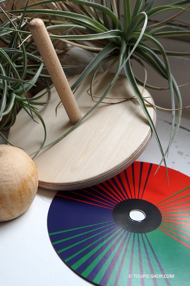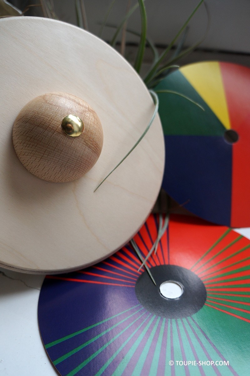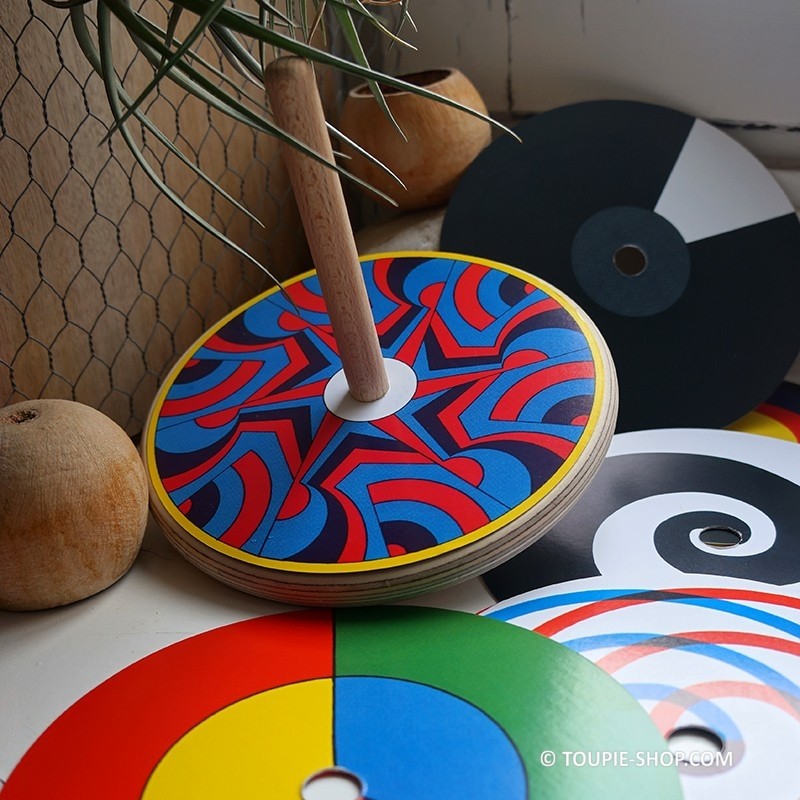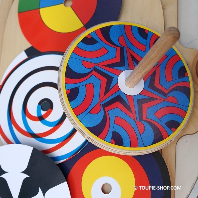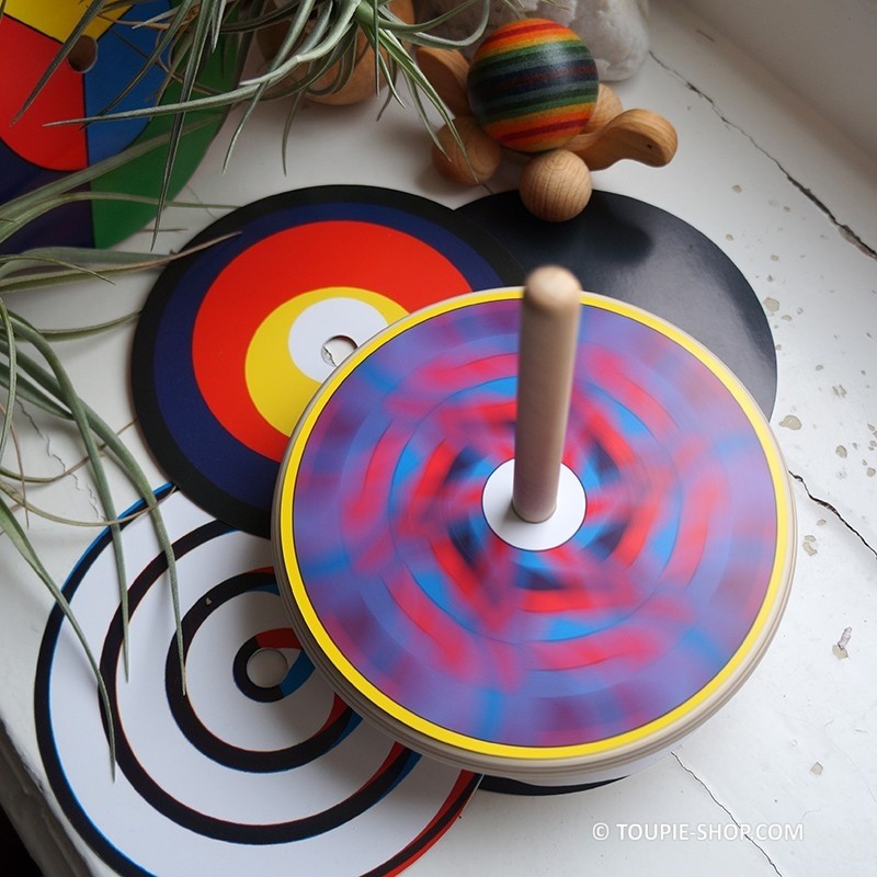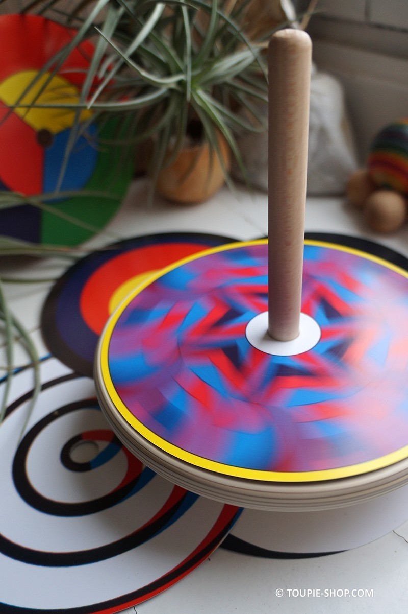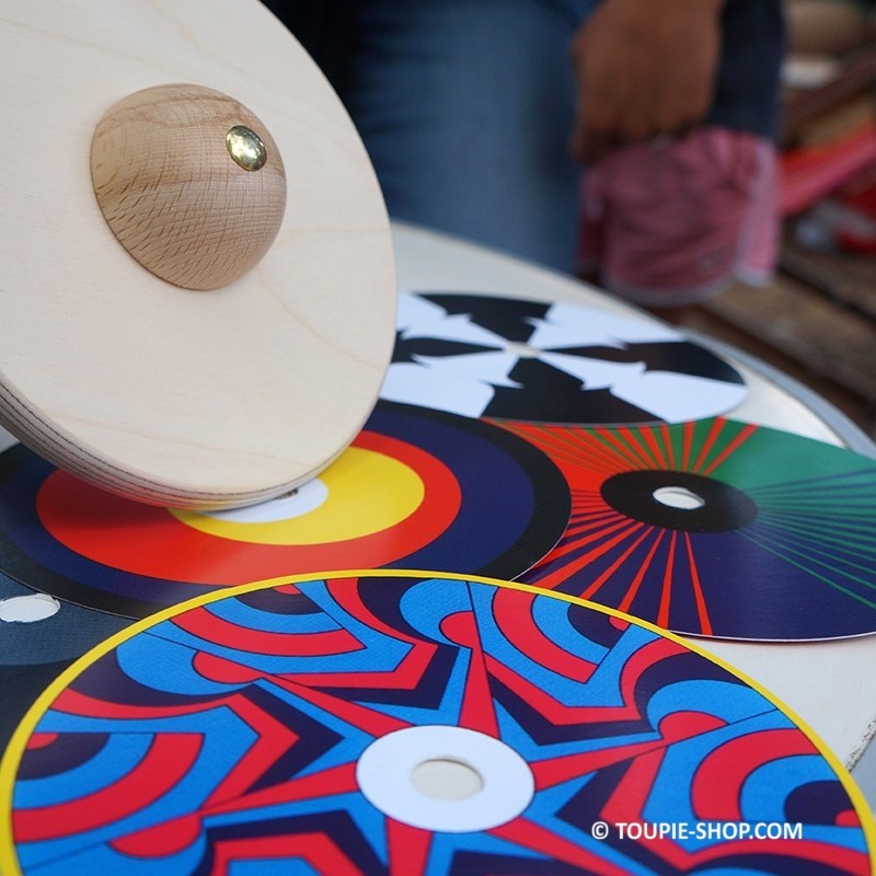 EN ROTATION : Sciences et toupies, ce modèle de jeux avec disques en papier vous en fera voir de toutes les couleurs ! Suivant les cercles choisis et la vitesse de rotation, cette toupie à effet optique mélange les couleurs. Jeux de fille et jouet de garçon, ne vous privez pas de ce grand jouet en bois comme jeux d'anniversaire pour enfant.