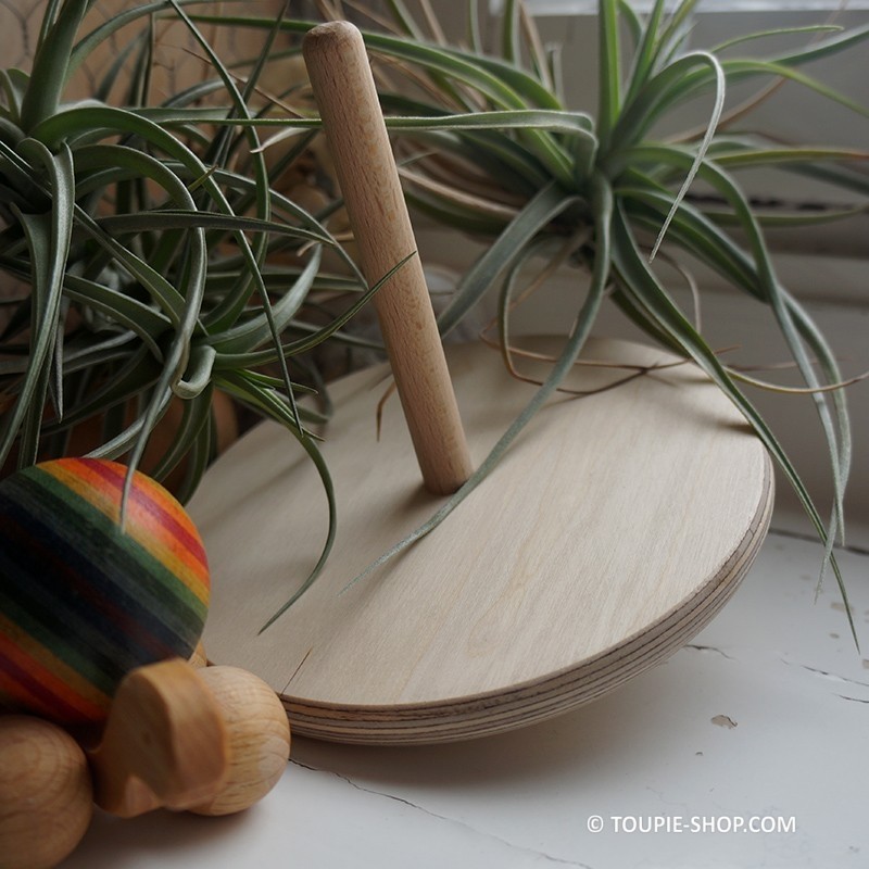 LANCER : Choisir un disque, le placer sur la grande toupie et faites tourner. Ce jouet en bois se stabilise et tourne longtemps. Vous pouvez lancer ce grand jeu en bois en frottant la tige de la toupie entre vos mains. Découvrez différents jeux éducatifs avec des toupies en bois, ce jeu expérimental toupie en bois avec anneaux de couleurs ou ce kit Sciences illusions optiques avec une toupie.