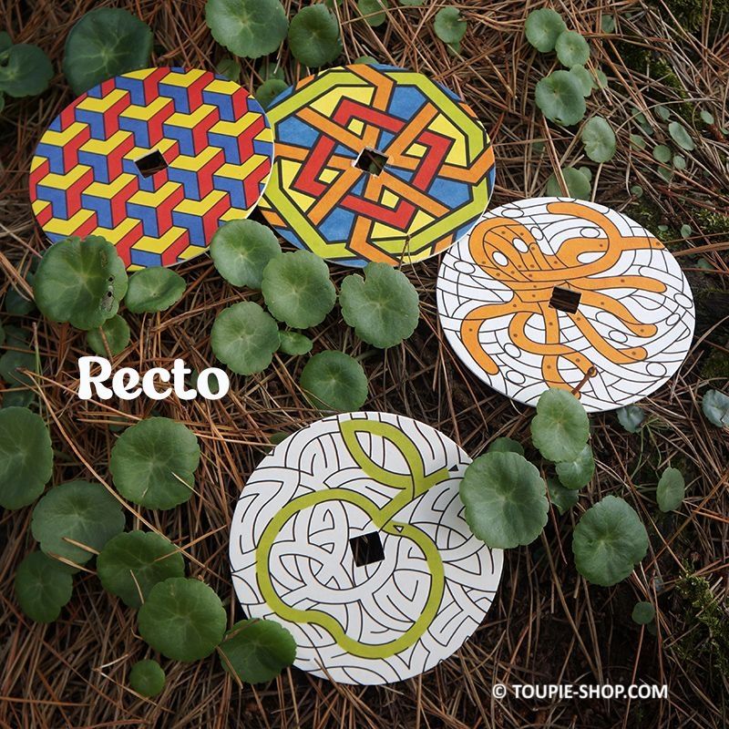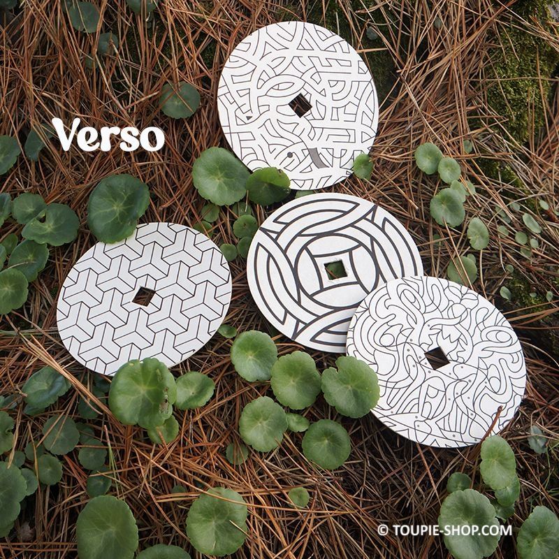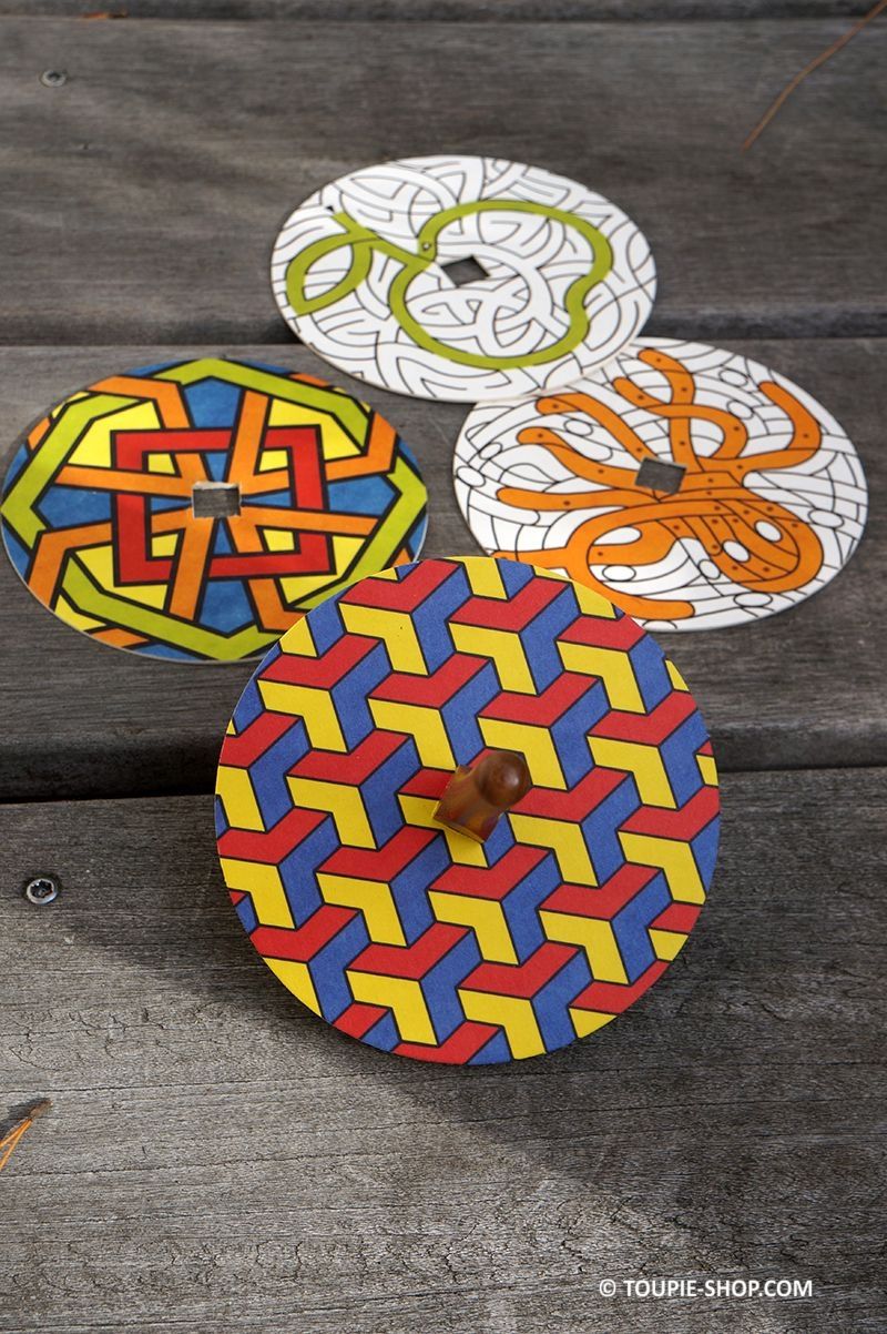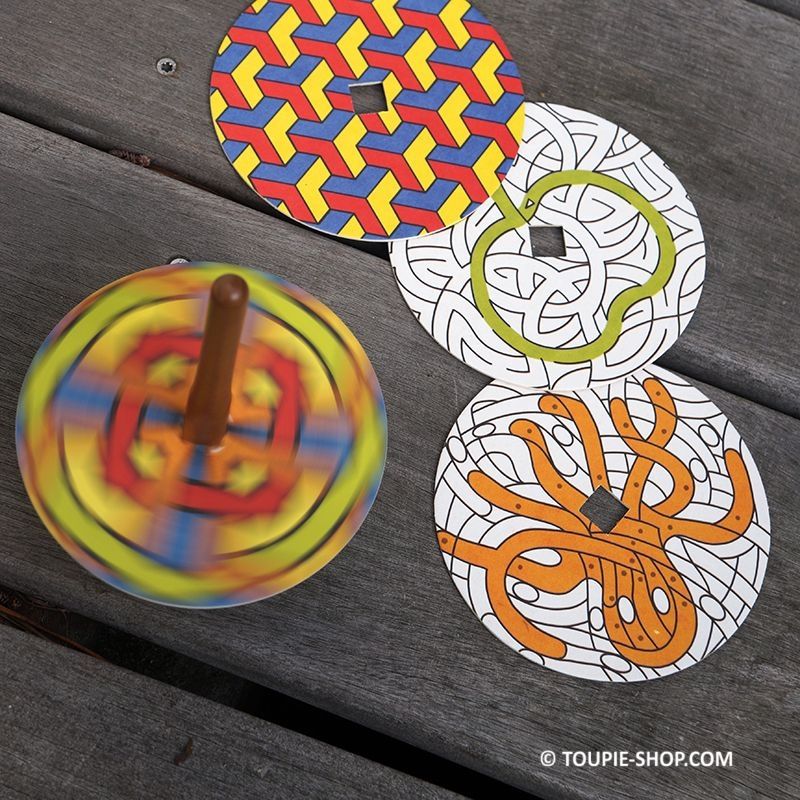 Jouet en bois artisanal, les illustrations des cercles sont bien pensées, un côté coloré qui montre l’exemple et un côté noir et blanc où vous pourrez vous exprimer. Cet atelier créatif pour enfant propose 2 jeux de labyrinthe, 2 dessins où les parties avec un point sont à colorier pour qu’apparaisse une forme et 4 illustrations géométriques, mon tout à tester en rotation grâce à la toupie en bois fournie.