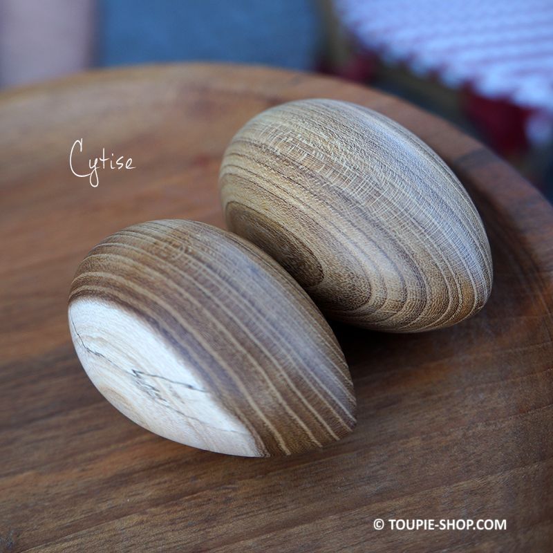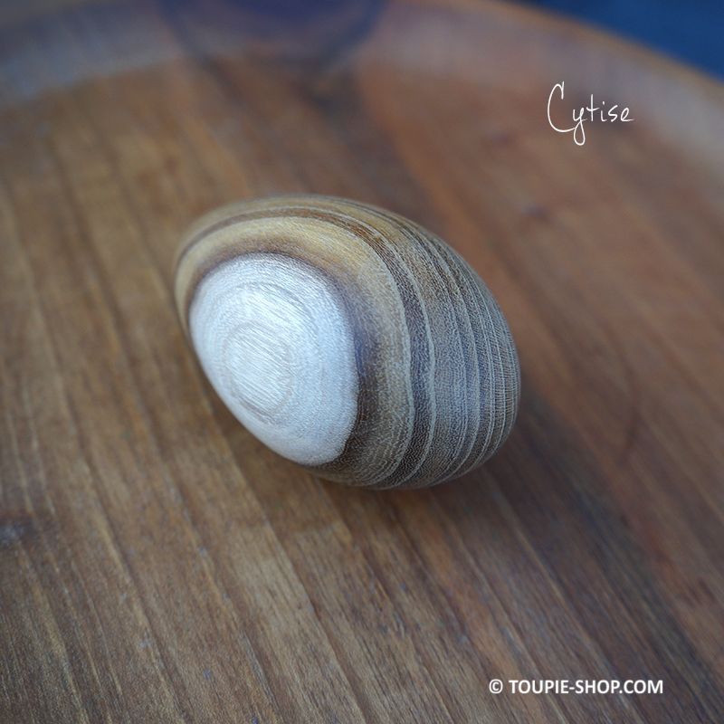 A L’ARRÊT : Cette toupie artisanale en bois a la forme d’un œuf d'environ 30-40 mm de diamètre, un joli objet artisanal fabriqué en France en plusieurs essences de bois :